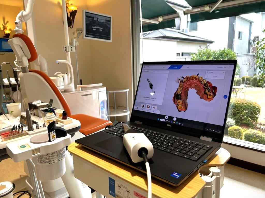 3Dで口の中の形をスキャンする機器です。従来の治療方法では、歯型を採る際に粘土状のものを口に入れるため、吐き気や不快な思いがあった方もいるかと思います。3Dスキャナーは連続写真を撮影することで3次元画像が構築されますので、「歯型をとられるのが苦手」を改善する治療法になります。